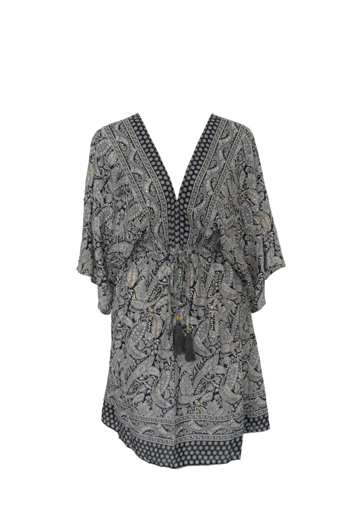 SKA V-Neck Silky Viscose Kaftan Batwing Summer Short Bombay Dress – Black & White